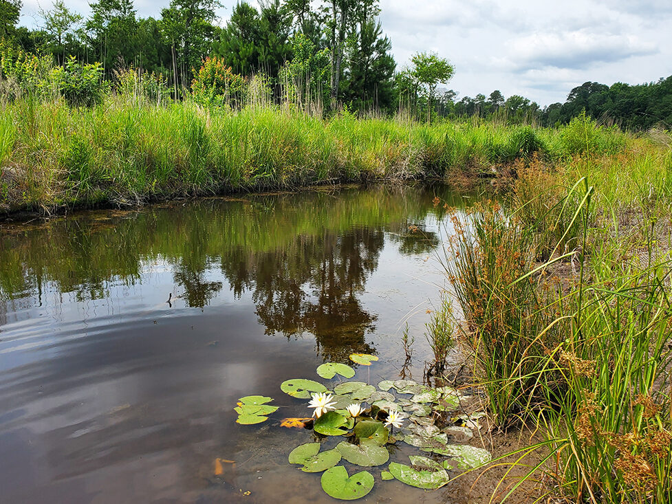Floating-leaved plants are rooted into aquatic substrate with leaves that float on the water surface. The American white water-lily (Nymphea odorata) leaves are covered by a waxy cuticle that repels water. This prevents the leaves from rotting. Photo 5 & 6: American Water-Lily (Nymphaea odorata) at Dudley Mill Pond Mitigation Site, North Carolina