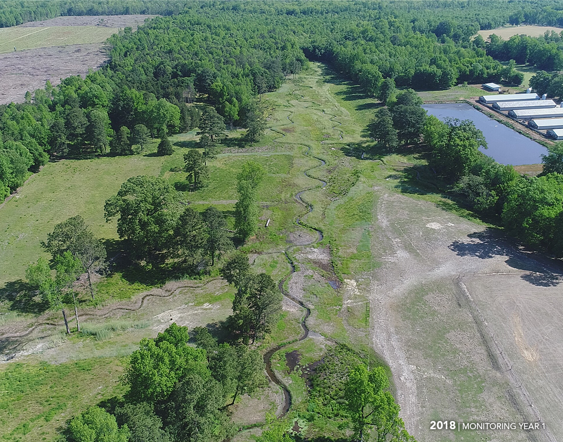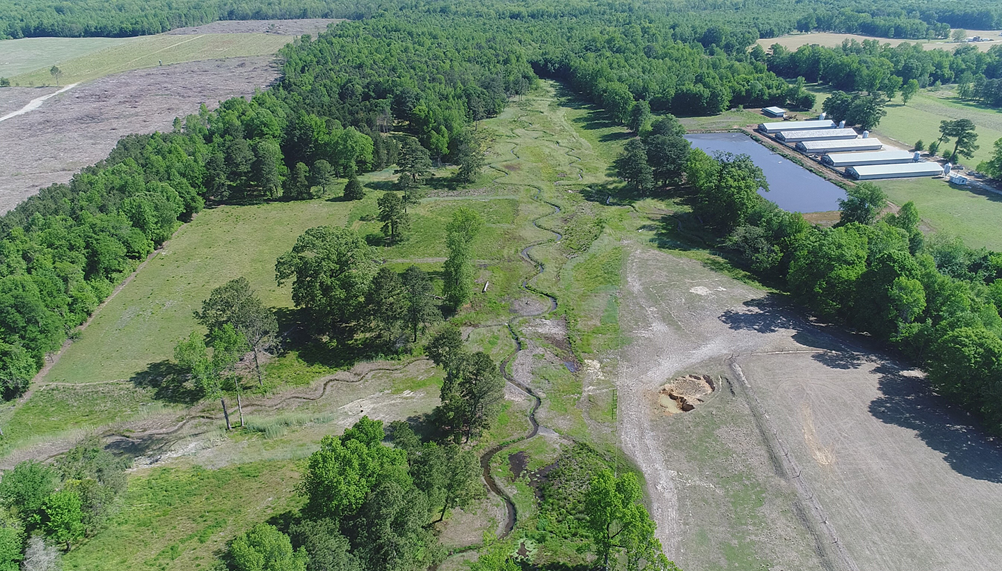 Falling Creek Umbrella Mitigation Bank is a private Wildlands-owned mitigation bank in the Neuse River Basin. The project involves restoration, enhancement, and preservation of streams, wetlands, and riparian buffers on an active cattle and hog farm. Stream banks were stabilized and planted, reducing sediment inputs to the streams. Streams were raised and drainage ditches filled to restore natural groundwater hydrology to former wetlands. The project will deliver approximately 18,900 stream credits, 56 wetland credits, and 1.7 million buffer credits. Aquatic habitats were restored and riparian buffers were planted. The livestock that previously had access to the streams were excluded from the easement with fencing. These activities also reduced nutrient loading to the streams on site and to downstream waters through reductions of sediment and livestock waste from the streams. Approximately 390 acres of land was placed under permanent conservation easement to protect the site in perpetuity. Construction was completed in the Spring of 2018. In October of 2018 the site received approximately 30 inches of rain in three days from Hurricane Florence. Minimal aggradation in two of the channels was the only observed damage from the storm.